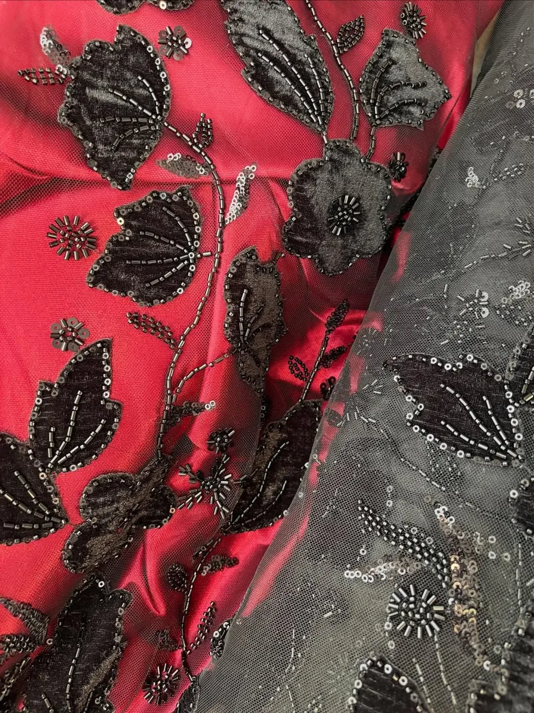 تور مخمل کارشده مشکی عرض ۱۴۵ متری